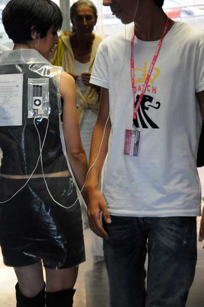 Sul retro del soprabito mostra ai passanti delle ISTRUZIONI PER L’USO e degli AURICOLARI.